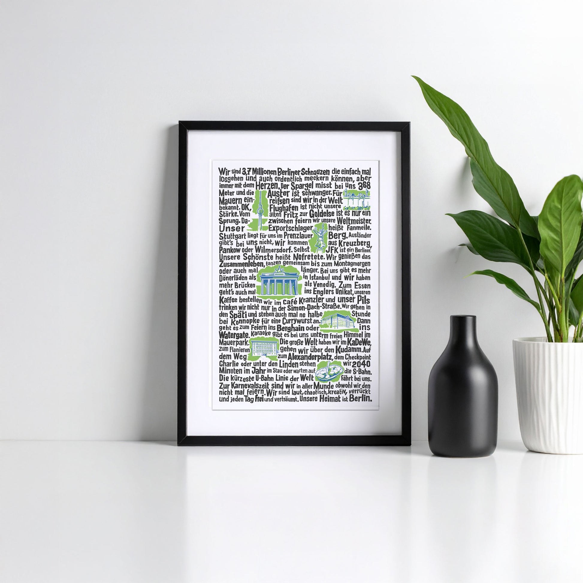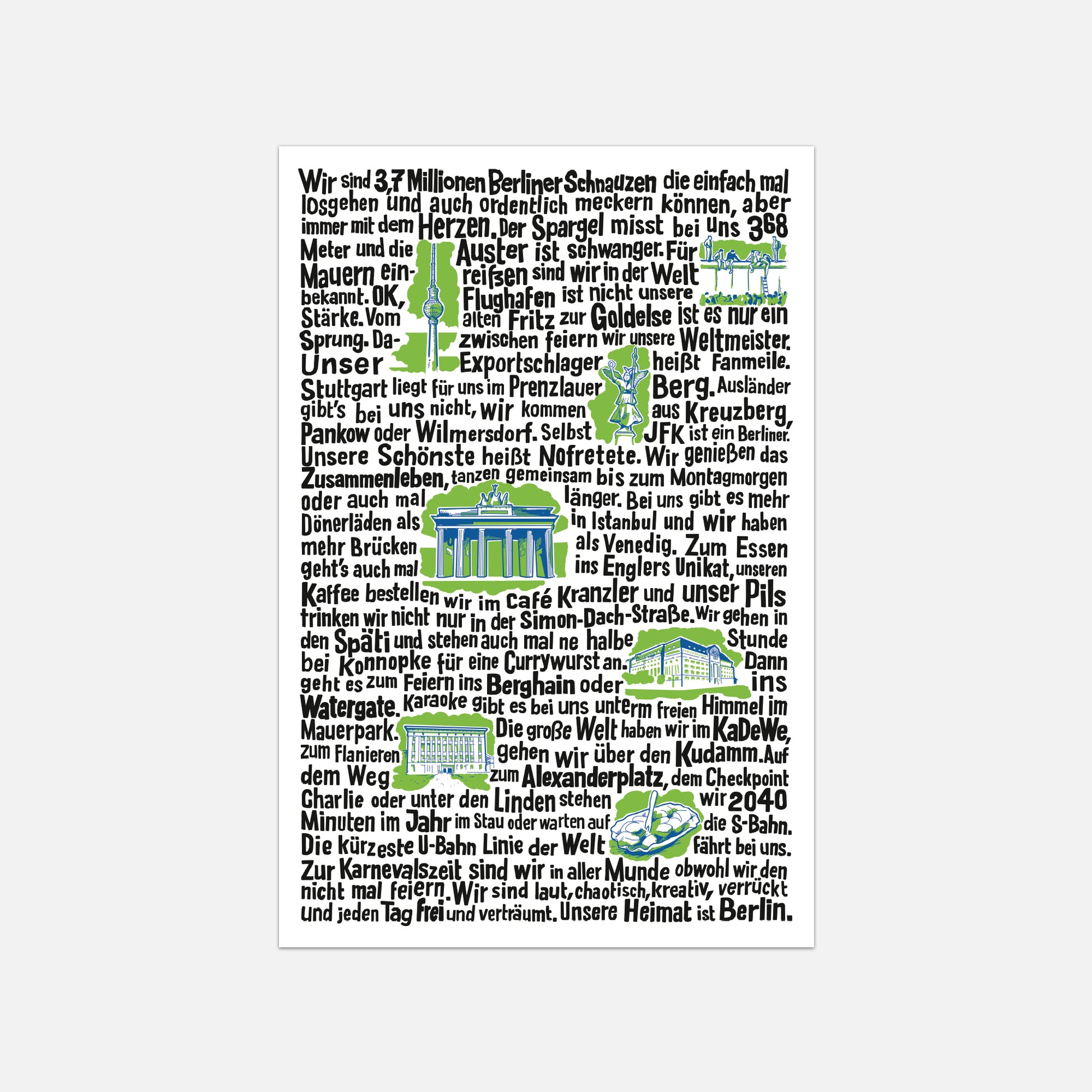 Wir sind 3,7 Millionen Berliner Schnauzen die einfach mal losgehen und auch ordentlich meckern können, aber immer mit dem Herzen. Der Spargel misst bei uns 368 Meter und die Auster ist schwanger. Für Mauern einreißen sind wir in der Welt bekannt. OK, Flughafen ist nicht unsere Stärke. Vom Alten Fritz zur Goldelse ist es nur ein Sprung. Dazwischen feiern wir unsere Weltmeister. Unser Exportschlager heißt Fanmeile. Stuttgart liegt für uns im Prenzlauer Berg. Ausländer gibt’s bei uns nicht, wir kommen aus Kreuzberg, Pankow oder Wilmersdorf. Selbst JFK ist ein Berliner. Unsere Schönste heißt Nofretete. Wir genießen das Zusammenleben, tanzen gemeinsam bis zum Montagmorgen oder auch mal länger. Bei uns gibt es mehr Dönerläden als in Istanbul und wir haben mehr Brücken als Venedig. Zum Essen geht’s auch mal ins Englers Unikat, unseren Kaffee bestellen wir im Café Kranzler und unser Pils trinken wir nicht nur in der Simon-Dach-Straße. Wir gehen in den Späti und stehen auch mal ne halbe Stunde bei Konnopke für eine Currywurst an. Dann geht es zum Feiern ins Berghain oder ins Watergate. Karaoke gibt es bei uns unterm freien Himmel im Mauerpark. Die große Welt haben wir im KaDeWe, zum Flanieren gehen wir über den Kudamm. Auf dem Weg zum Alexanderplatz, dem Checkpoint Charlie oder Unter den Linden stehen wir 2040 Minuten im Jahr im Stau oder warten auf die S-Bahn. Die kürzeste U-Bahn Linie der Welt fährt bei uns. Zur Karnevalszeit sind wir in aller Munde, obwohl wir den nicht mal feiern. Wir sind laut, chaotisch, kreativ, verrückt und jeden Tag frei und verträumt. Unsere Heimat ist Berlin.