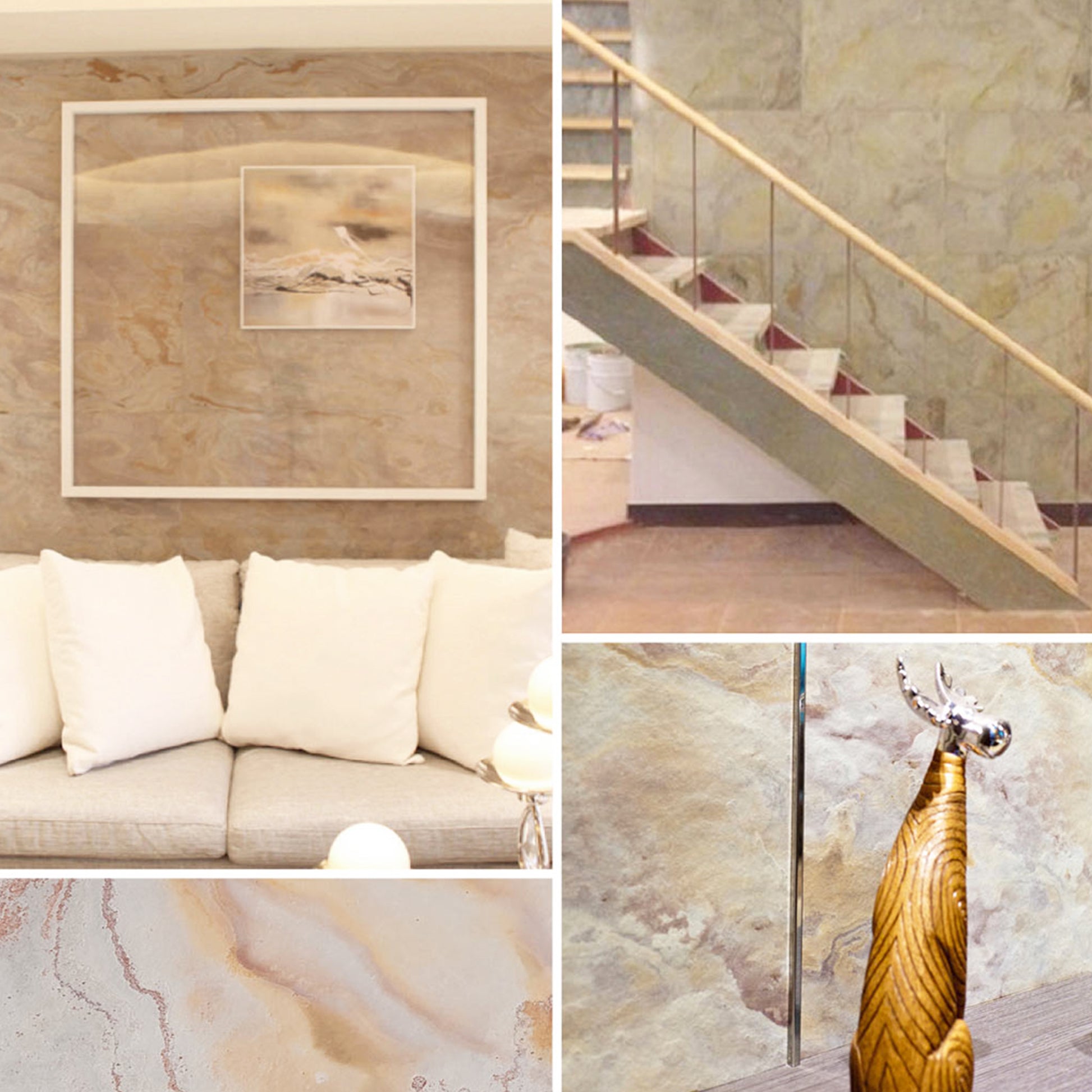 Blanco ist ein Buntschieferdekor mit einer echten Steinoberfläche Der Buntschiefer zeichnet sich durch matte Farben, aber oft sehr stark durchwachsene Verläufe mit blumigen Mustern aus.