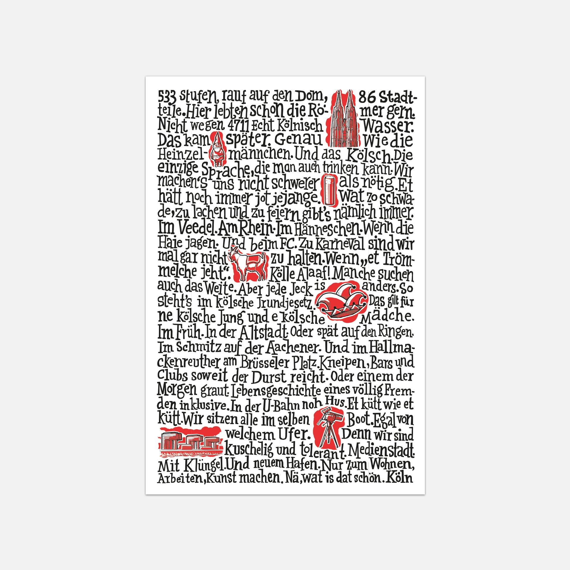 Wir haben eine 2000 Jahre alte Geschichte. Und ein eigenes Grundgesetz. Wir sind über eine Million Jungs und Mädche. Aufgeschlossen. Und zuversichtlich. Et kütt wie et kütt. An unserem Ludwig führt kein Weg vorbei. Und der dicke Herkules kann 30 Tonnen stemmen. Alle kennen unseren Dom. Aber nur wir unser Veedel. Wir wissen: unsere Haie haben keine Flosse auf dem Rücken, sondern Eis unter den Kufen. Und unsere Geißböcke stehen auf dem Spielfeld. Nicht auf der Weide. Wir raven auf den Ringen. Und radeln am Rhein entlang. Linke oder rechte Seite. Sieben Brücken, die verbinden. Schäl sick war gestern. Wir sitzen alle im selben Boot. Ufer egal. Wir verputzen halve Hähne. Und werfen Kamelle an Karneval. Die Römer sagten Ave. Wir rufen Alaaf. Wir sind Genießer. Wo sonst gibt es ein Mu- seum für Schokolade. Oder einen Grüngürtel zum Schlendern. Wir chillen am Mäuerchen. Grillen am Aachener. Und spielen Tischtennis im Belgischen. Gesel- lig. Gemütlich. Gelassen. Lieber im Brauhaus als in der Stube. Deshalb kann es bei uns auch mal spät werden. Selbst mit einem Früh. Dann marschieren wir die Zülpicher rauf und runter. Und feiern im Gewölbe. Oder im Odonien. Bis uns der Morgen graut. Am Ende heißt es bei uns nicht Klappe zu. Sondern Deckel drauf. Hier. In der Metropole mit Herz. Wo man sich kennt. Und hilft. Du bist mehr als eine Stadt. Du bes e Jeföhl. Köln.