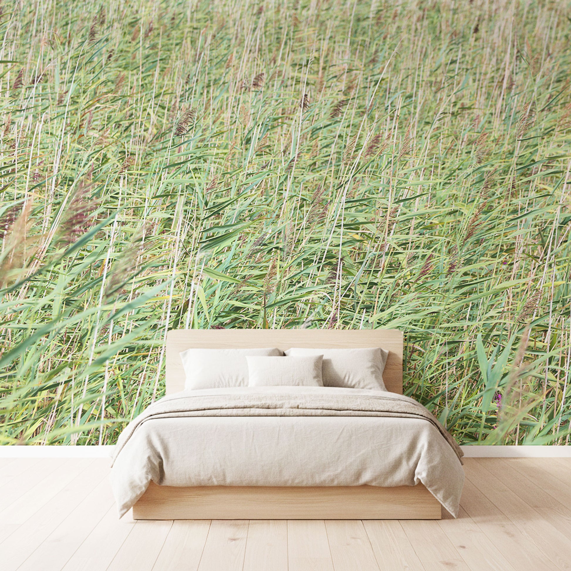 Diese Fototapete zeigt ein sanft wiegendes Hochgrasfeld in natürlichen Grün- und Beigetönen. Die filigranen Halme und das warme Lichtspiel schaffen eine ruhige, weite Atmosphäre und verleihen dem Raum eine stilvolle, naturnahe Ausstrahlung – harmonisch, lebendig und zugleich entspannend.