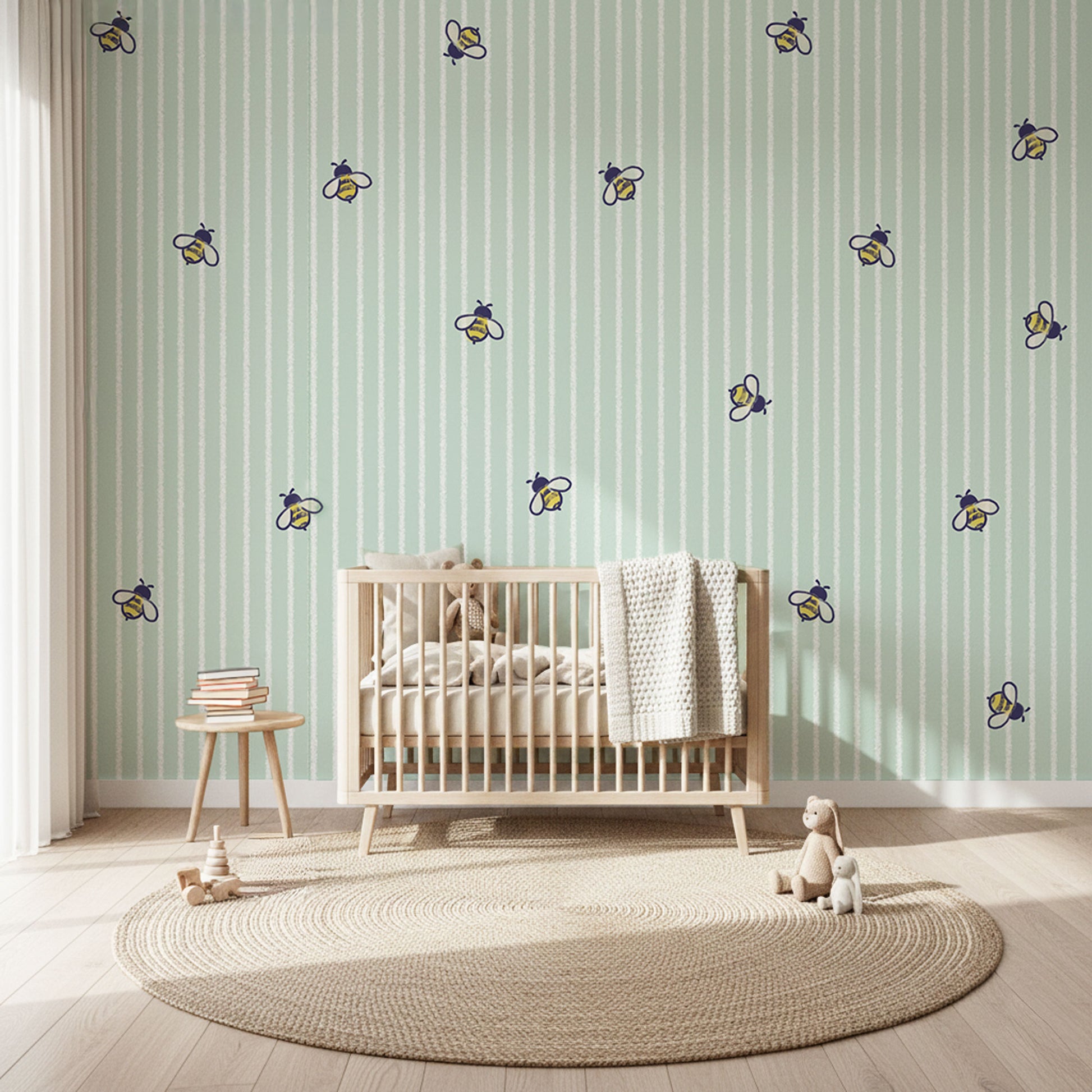 Mit fröhlich summenden Bienen, liebevollen Details und einem charmanten Streifenmuster bringt diese Tapete verspielte Leichtigkeit ins Kinderzimmer. In vier harmonischen Farbvarianten erhältlich, sorgt sie für eine warme, fröhliche Atmosphäre und lädt kleine Entdecker zum Träumen, Spielen und Kuscheln ein!