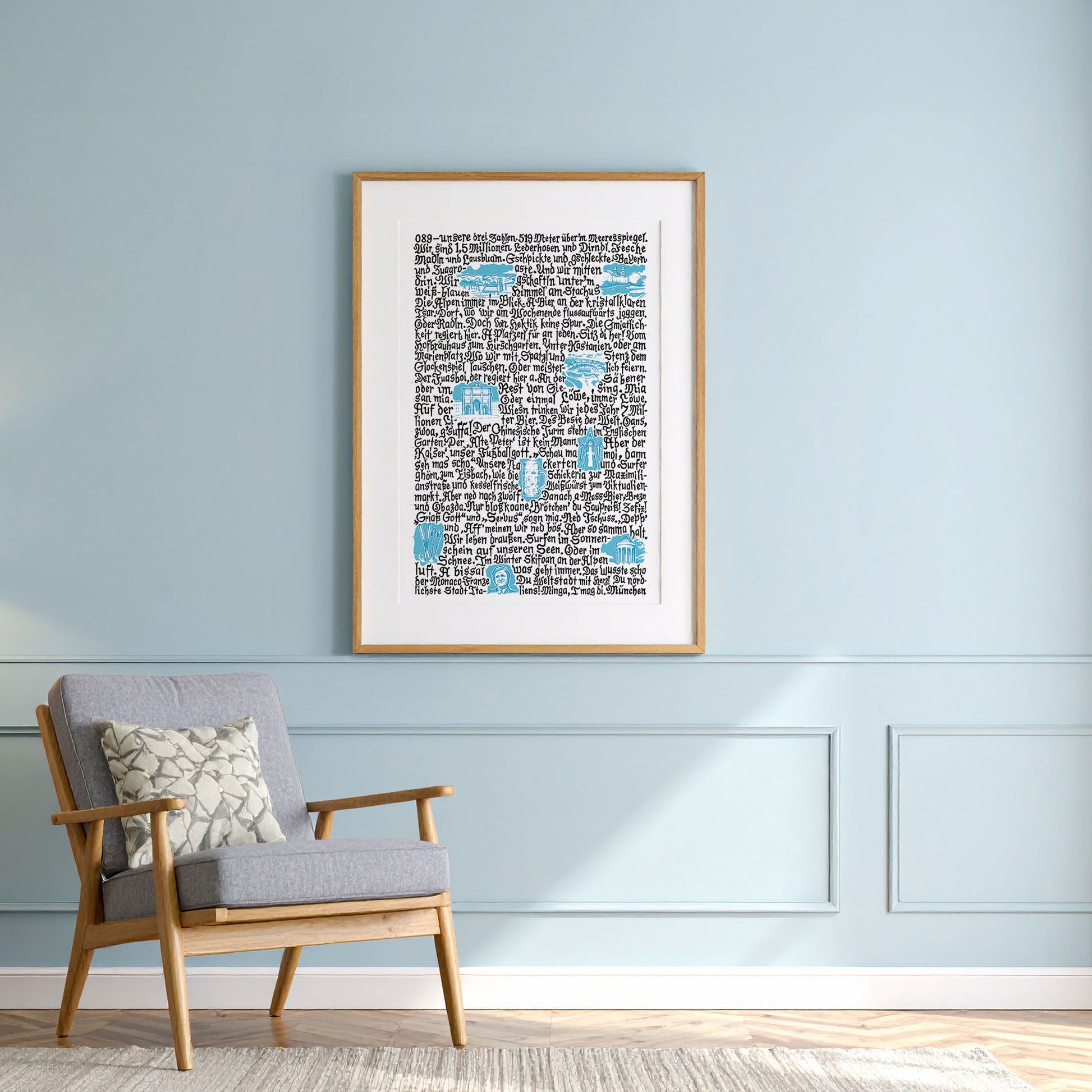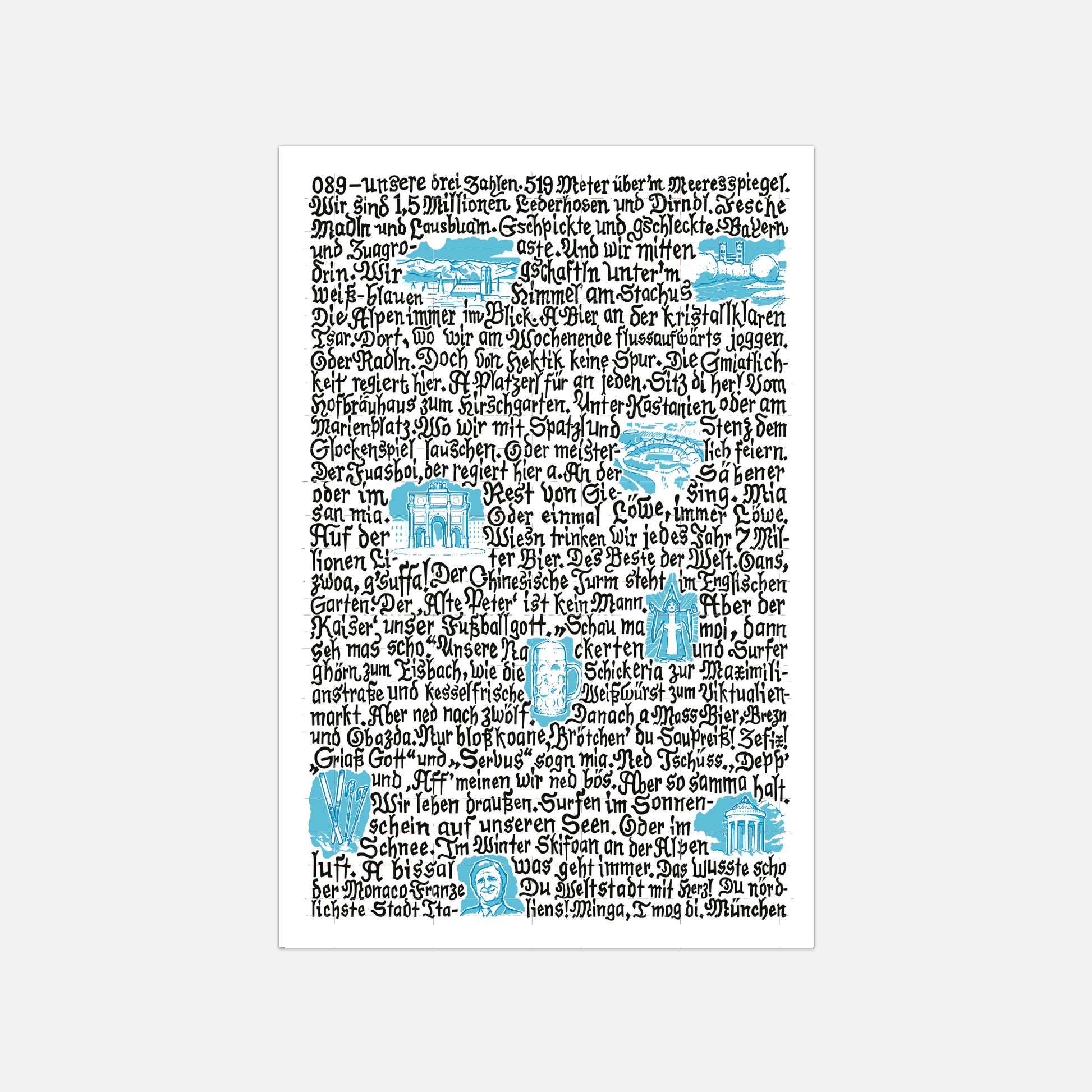 089 – unsere drei Zahlen. 519 Meter über’m Meeresspiegel. Wir sind 1,5 Millionen Lederhosen und Dirndln. Fesche Madln und Lausbuam. Gschpickte und gschleckte. Bayern und Zuagroaste. Und wir mitten drin. Wir gschaftln unter’m weiß-blauen Himmel am Stachus. Die Alpen immer im Blick. A Bier an der kristallklaren Isar. Dort, wo wir am Wochenende flußaufwärts joggen. Oder Radln. Doch von Hektik keine Spur. Die Gmiatlichkeit regiert hier. A Platzerl für an jeden. Sitz di her! Vom Hofbräuhaus zum Hirschgarten. Unter Kastanien oder am Marienplatz. Wo wir mit Spatzl und Stenz dem Glockenspiel lauschen. Oder meisterlich feiern. Der Fuasboi, der regiert hier a. An der Säbener oder im Rest von Giesing. Mia san mia. Oder einmal Löwe, immer Löwe. Auf der Wiesn trinken wir jedes Jahr 7 Millionen Liter Bier. Des Beste der Welt. Oans, zwoa, g’suffa! Der Chinesische Turm steht im Englischen Garten. Der 'Alte Peter' ist kein Mann. Aber der 'Kaiser' unser Fußballgott. „Schau ma moi, dann seh mas scho.“ Unsere Nackerten und Surfer ghörn zum Eisbach, wie die Schickeria zur Maximilianstraße und kesselfrische Weißwürst zum Viktualienmarkt. Aber ned nach zwölf. Danach a Mass Bier, Brezn und Obazda. Nur bloß koane ‚Brötchen’ du Saupreiß! Zefix! „Griaß Gott“ und „Servus“ sogn mia. Ned Tschüss. ‚Depp’ und ‚Aff’ meinen wir ned bös. Aber so samma halt. Wir leben draußen. Surfen im Sonnenschein auf unseren Seen. Oder im Schnee. Im Winter Skifoan an der Alpenluft. A bissal was geht immer. Das wusste scho der Monaco Franze. Du Weltstadt mit Herz! Du nördlichste Stadt Italiens! Minga, I mog di. München
