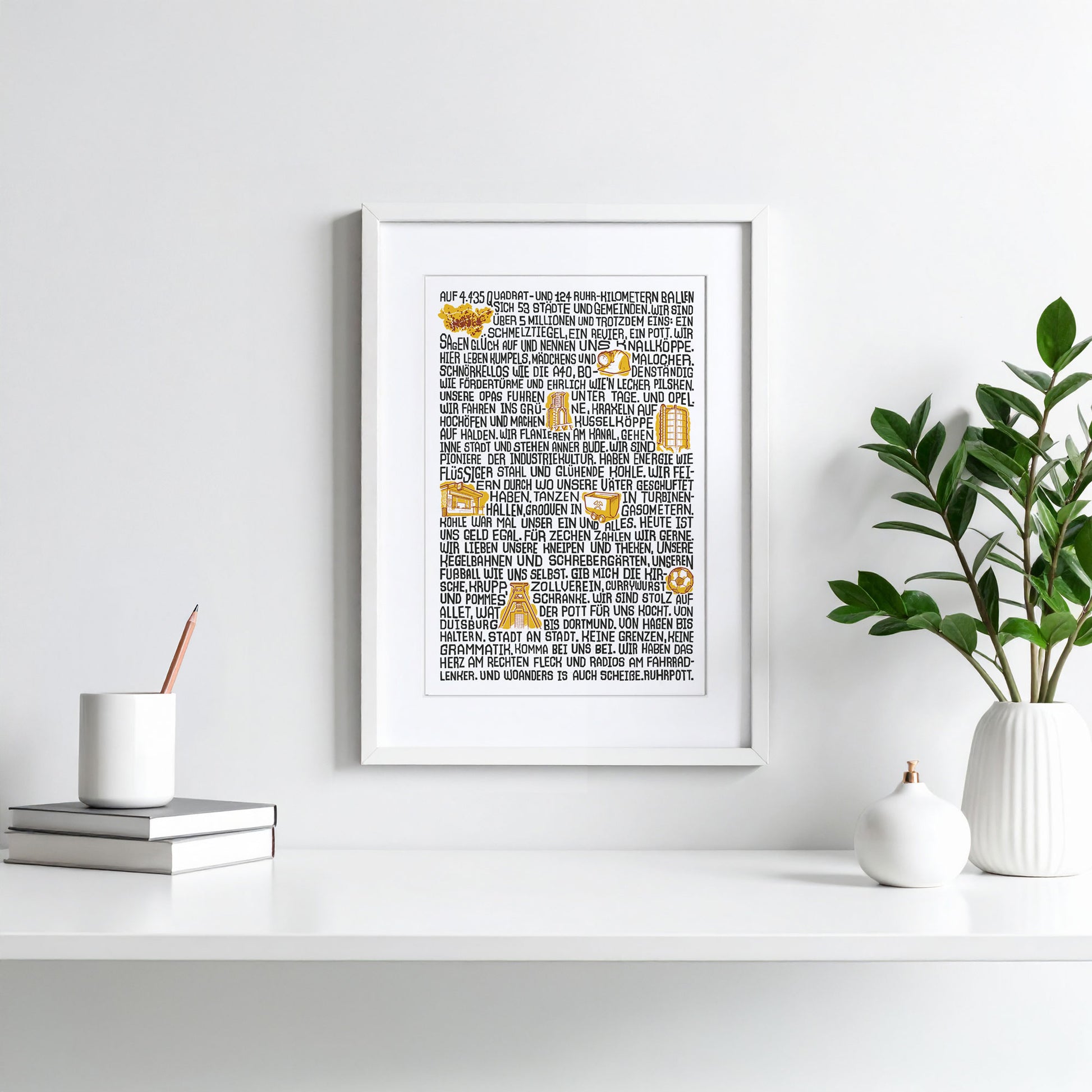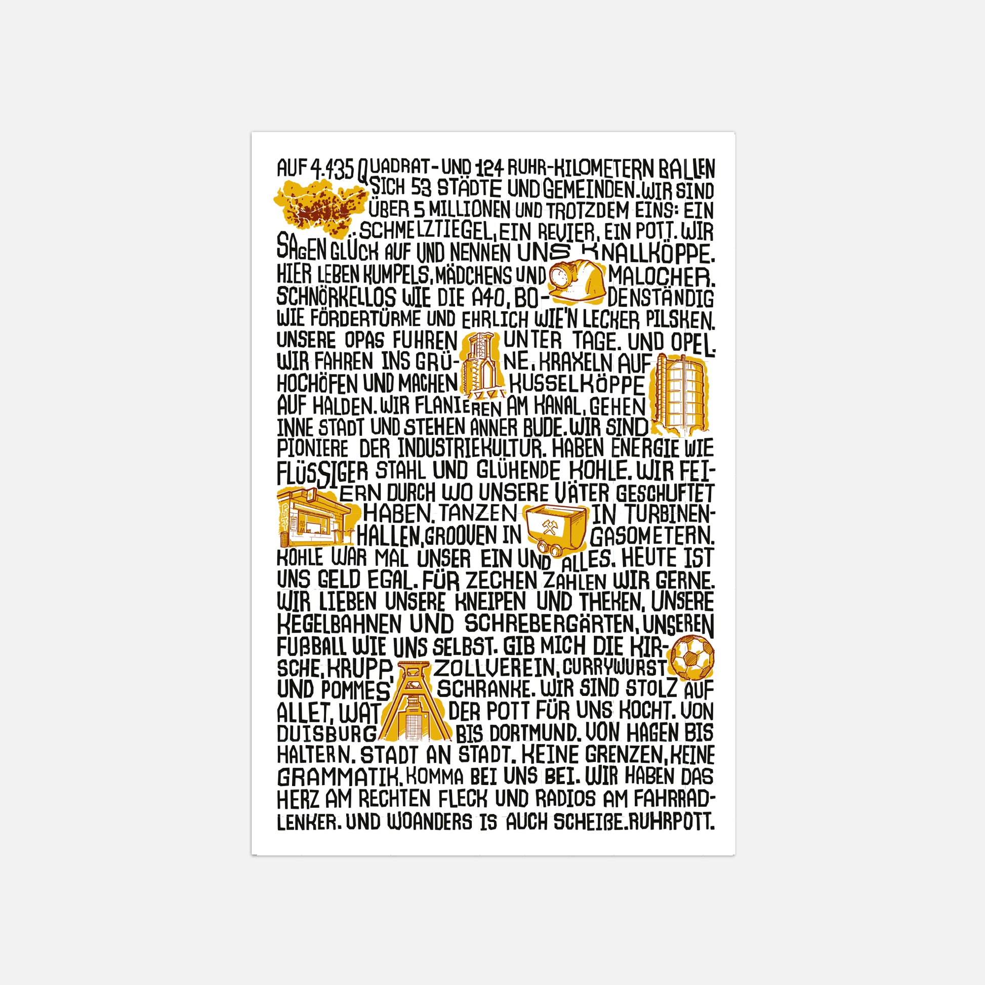 Auf 4.435 Quadrat- und 124 Ruhr-Kilometern ballen sich 53 Städte und Gemeinden. Wir sind über 5 Millionen und trotzdem Eins: ein Schmelztiegel, ein Revier, ein Pott. Wir sagen Glück Auf und nennen uns Knallköppe. Hier leben Kumpels, Mädchens und Malocher. Schnörkellos wie die A40, bodenständig wie Fördertürme und ehrlich wie’n lecker Pilsken. Unsere Opas fuhren unter Tage. Und Opel. Wir fahren ins Grüne, kraxeln auf Hochöfen und machen Kusselköppe auf Halden. Wir flanieren am Kanal, gehen inne Stadt und stehen anner Bude. Wir sind Pioniere der Industriekultur. Haben Energie wie flüssiger Stahl und glühende Kohle. Wir feiern durch wo unsere Väter geschuftet haben. Tanzen in Turbinenhallen, grooven in Gasometern. Kohle war mal unser ein und alles. Heute ist uns Geld egal. Für Zechen zahlen wir gerne. Wir lieben unsere Kneipen und Theken, unsere Kegelbahnen und Schrebergärten, unseren Fußball wie uns selbst. Gib mich die Kirsche, Krupp, Zollverein, Currywurst und Pommes Schranke. Wir sind stolz auf allet, wat der Pott für uns kocht. Von Duisburg bis Dortmund. Von Hagen bis Haltern. Stadt an Stadt. Keine Grenzen, keine Grammatik. Komma bei uns bei. Wir haben das Herz am rechten Fleck und Radios am Fahrradlenker. Und woanders is auch Scheiße. Ruhrpott.