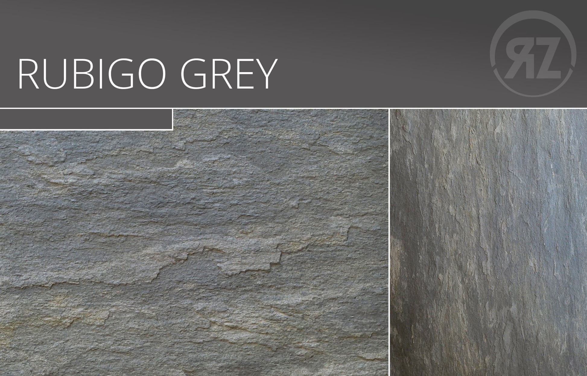 Rubigo Grey ist ein dunkleres Dekor mit einer gräulichen Grundfarbe, das Strukturen in leichten Braun- oder Blau-Tönen enthalten kann.