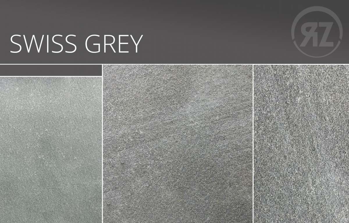 Swiss Grey ist ein Dekor mit gräulicher Grundfärbung. Die Oberflächenstruktur ist i.d.R. eher homogen ohne größere Muster oder Maserunge. Sandstein-Dekore bestechen durch eine leicht raue, eher körnige Oberfläche mit leichten Höhenunterschieden.